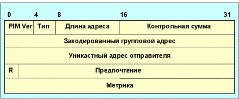 Рис. 4.4.9.5.11. Формат сообщения assert Поле закодированный групповой адрес характеризует групповой адрес места назначения пакетов, который явился причиной посылки сообщения assert. Поле уникастный адрес отправителя содержит IP-адрес отправителя из дейтограммы, вызвавшей посылку мультикастного пакета Assert. Длина поля в байтах определена полем длины адреса. Поле R представляет собой RPT-бит. Если IP мультикастинг дейтограмма, вызвавшая посылку пакета assert направляется вниз по RP-дереву, тогда RPT-бит равен 1. Если маршрутизация осуществляется вдоль SPT, бит равен 0. Поле предпочтение несет в себе значения кода предпочтения, присвоенного уникастному протоколу маршрутизации, который организует проход до ЭВМ. Поле метрика содержит значение метрики для таблицы маршрутизации. Единицы измерения должны соответствовать требованиям маршрутного протокола. Сообщения кандидата RP посылаются периодически C-RP способом и уникастно адресуются к BSR. Формат таких сообщений показан на рис. 4.4.9.5.12.