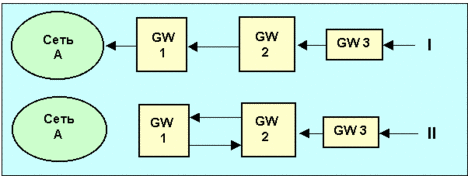 На верхней части рисунка показана ситуация, когда маршрутизаторы указывают маршрут до сети в соответствии со стрелками. На нижней части связь на участке GW1 <Сеть a> оборвана, а GW2 по-прежнему продолжает оповещать о ее доступности с числом шагов, равным 2. При этом GW1, восприняв эту информацию (если GW2 успел передать свою маршрутную информацию раньше GW1), может перенаправить пакеты, адресованные сети А, на GW2, а в своей маршрутной таблице будет характеризовать путь до сети А метрикой 3. При этом формируется замкнутая петля маршрутов. Последующая широковещательная передача маршрутных данных GW1 и GW2 не решит эту проблему быстро. Так после очередного обмена путь от gw2 до сети А будет характеризоваться метрикой 5. Этот процесс будет продолжаться до тех пор, пока метрика не станет равной 16, а это займет слишком много циклов обмена маршрутной информацией. Проблема может быть решена следующим образом. Маршрутизатор запоминает, через какой интерфейс получена маршрутная информация, и через этот интерфейс эту информацию уже не передает. В рассмотренном выше примере GW2 не станет посылать информацию о пути к сети А маршрутизатору GW1, от которого он получил эти данные. В этом случае в маршрутной таблице GW1 путь до А исчезнет сразу. Остальные маршрутизаторы узнают о недостижимости сети А через несколько циклов. Существуют и другие пути преодоления медленных переходных процессов. Если производится оповещение о коротком пути, все узлы-получатели воспринимают эти данные немедленно. Если же маршрутизатор закрывает какой-то путь, его отмена фиксируется остальными лишь по тайм-ауту. Универсальным методом исключения ошибок при маршрутизации является использование достаточно большой выдержки, перед тем как использовать информацию об изменении маршрутов. В этом случае к моменту изменения маршрута эта информация станет доступной всем участникам процесса маршрутизации. Но все перечисленные методы и некоторые другие известные алгоритмы, решая одну проблему, часто вносят другие. Многие из этих методов могут при определенных условиях вызвать лавину широковещательных сообщений, что также дезорганизует сеть. Именно малая скорость установления маршрутов в RIP (и других протоколах, ориентированных на вектор расстояния) и является причиной их постепенного вытеснения другими протоколами. Но даже усовершенствование, изложенное выше, не всегда срабатывает. На рис. 4.4.11.1а приведен пример, когда переходной процесс, несмотря на усовершенствование будет идти долго. При обрыве связи В-Г узлы А и Б сообщают узлу В, что они потеряли связь с узлом Г. Узел В делает вывод, что Г не достижим, о чем и сообщает узлам А и Б. К сожалению А знает, что Б имеет проход к Г длиной 2, из чего он делает вывод о достижимости Г за три шага. Аналогично рассуждает Б о возможности достижимости Г через А. Далее при последующих рассылках метрика доступности Г, характеризуется все большими значениями, до тех пор пока не станет равной "бесконечности".