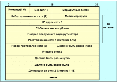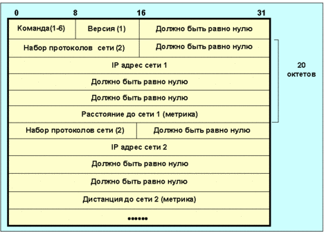 Поле версия для RIP равно 1 (для RIP-2 двум). Поле набор протоколов сети i определяет набор протоколов, которые используются в соответствующей сети (для Интернет это поле имеет значение 2). Поле расстояние до сети i содержит целое число шагов (от 1 до 15) до данной сети. В одном сообщении может присутствовать информация о 25 маршрутах. При реализации RIP можно выделить следующие режимы: Инициализация, определение всех "живых" интерфейсов путем посылки запросов, получение таблиц маршрутизации от других маршрутизаторов. Часто используются широковещательные запросы. Получен запрос. В зависимости от типа запроса высылается адресату полная таблица маршрутизации, или проводится индивидуальная обработка. Получен отклик. Проводится коррекция таблицы маршрутизации (удаление, исправление, добавление).