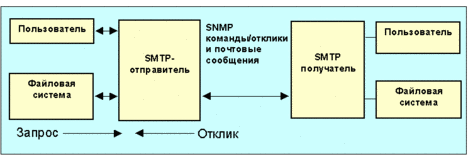 Рис. 4.4.14.1 Схема взаимодействия различных частей почтовой системы Для решения поставленной задачи SMTP-сервер должен знать имя конечного получателя и название почтового ящика места назначения. Аргументом команды MAIL является адрес отправителя (обратный адрес). Аргументом команды RCPT служит адрес конечного получателя. Обратный адрес используется для посылки сообщения в случае ошибки. Все отклики имеют цифровые коды. Команды, отклики и имена ЭВМ не чувствительны к тому, строчные или прописные символы использованы при их написании. Это не всегда справедливо при написании имен и адресов получателя. Многие почтовые системы работают только с ASCII-символами. Если транспортный канал работает с октетами, 7-битные коды будут дополнены нулевым восьмым битом. Именно здесь коренилась проблема пересылки почтовых сообщений на русском языке несколько лет назад(русский алфавит требует 8-битового представления). Как уже было сказано, процедура отправки почтового сообщения начинается с посылки команды MAIL, которая имеет формат: MAIL <SP> FROM:<reverse-path> <CRLF>, где <SP> - пробел, <CRLF> - комбинация кодов возврата каретки и перехода на новую строку, а <reverse-path> - обратный путь. Эта команда сообщает SMTP-получателю, что стартует новая процедура и следует сбросить в исходное состояние все статусные таблицы, буферы и т.д. Если команда прошла, получатель реагирует откликом: 250 OK. Аргумент может содержать не только адрес почтового ящика, в общем случае является списком адресов ЭВМ-серверов, через которые пришло данное сообщение, включая, разумеется, и адрес почтового ящика отправителя. Первым в списке <reverse-path> стоит адрес ЭВМ-отправителя. После прохождения команды MAIL посылается команда RCPT: RCPT <SP> TO:<forward-path> <CRLF> Эта команда указывает адрес конечного получателя (<forward-path>). При благополучном прохождении команды получатель посылает код-отклик 250 OK, и запоминает полученный адрес. Если получатель неизвестен, SMTP-сервер пошлет отклик 550 Failure reply. Команда RCPT может повторяться сколько угодно раз, если адресат не один. Аргумент может содержать не только адрес почтового ящика, но и маршрутный список ЭВМ по дороге к нему. Первым в этом списке должно стоять имя ЭВМ, получившей данную команду. По завершении этого этапа посылается собственно сообщение: DATA <CRLF> При правильном приеме этого сообщения SMTP-сервер реагирует посылкой отклика 354 Intermediate reply (промежуточный отклик), и рассматривает все последующие строки в качестве почтового текста. При получении кода конца текста отправляется отклик: 250 OK. Признаком конца почтового сообщения является точка в самом начале строки, за которой следует <CRLF>. Пользователям почтовых UNIX-систем это уже известно. В некоторых случаях адрес места назначения может содержать ошибку, но получатель знает правильный адрес. Тогда возможны два варианта отклика: 1. 251 User not local; will forward to <forward-path> Это означает, что получатель берет на себя ответственность за доставку сообщения. Это случается, когда адресат, например, мигрировал в другую субсеть в пределах зоны действия данного почтового сервера. 2. 551 User not local; please try <forward-path> Получатель знает правильный адрес и предлагает отправителю переадресовать сообщение по адресу <forward-path>. SMTP имеет команды для проверки корректности имени адресата (VRFY) и расширения списка адресов (EXPN). Обе команды в качестве аргументов используют строки символо