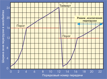 Рис. 4.4.3.6. Эволюция ширины окна при медленном старте Здесь предполагается, что MSS=1 Кбайт. Началу диаграммы соответствует установка значения ssthresh=16 Kбайт. Данная схема позволяет более точно выбрать значение cwnd. После таймаута, который на рисунке произошел при передаче c номером 12, значение порога понижается до 12 Кбайт (=cwnd/2). Ширина окна cwnd снова начинает расти от передачи к передаче, начиная с одного сегмента, вплоть до нового значения порога ssthresh=12 Кбайт. Стратегия с экспоненциальным и линейным участками изменения ширины окна переполнения позволяет несколько приблизить среднее его значение к оптимальному. Для локальных сетей, где значение RTT невелико, а вероятность потери пакета мала, оптимизация задания cwnd не так существенна, как в случае протяженных внешних (например, спутниковых) каналов. Ситуация может поменяться, если в локальной сети имеется фрагмент, где вероятность потерь пакетов велика. Таким фрагментом может быть МАС-бридж (или переключатель), один из каналов которого подключен к сегменту Fast Ethernet, а другой к обычному Ethernet на 10 Мбит/c. Если такой мост не снабжен системой подавления перегрузки (до сих пор такие приборы не имели подобных систем), то каждый из пакетов будет потерян в среднем 9 раз, прежде чем будет передан (здесь предполагается, что передача идет из сегмента FE). При этом cwnd будет практически все время равно MSS, что крайне неэффективно при передаче по каналам Интернет. Такие потери вызовут определенные ошибки при вычислении среднего значения и дисперсии RTT, а как следствие и величин таймаутов. Применение в таких местах маршрутизаторов или других приборов, способных реагировать на перегрузку посредством ICMP(4), решает эту проблему. Для взаимного согласования операций в рамках TCP-протокола используется четыре таймера: