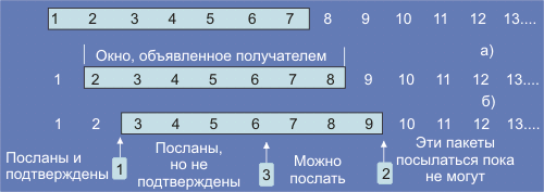 Рис. 4.4.3.5. Схема использования скользящего окна После прихода отклика на пакет <1> окно смещается вправо на одну позицию. Теперь отправитель может послать и пакет <8>. Если порядок прихода откликов нарушается, сдвиг окна может задержаться. Размер окна в сегментах определяется соотношением: window > RTT*B/MSS, где B - полоса пропускания канала в бит/с, а MSS - максимальный размер сегмента в битах, а window - в сегментах. Для протокола TCP механизм скользящего окна может работать на уровне октетов или сегментов. В первом случае нужно учитывать каждый раз размер поля данных переданного и подтвержденного сегмента. В TCP-протоколе используется три указателя (стрелки на рис. 4.4.3.3б): Первый указатель определяет положение левого края окна, отделяя посланный сегмент, получивший подтверждение, от посланного сегмента, получение которого не подтверждено. Второй указатель отмечает правый край окна и указывает на сегмент, который может быть послан до получения очередного подтверждения. Третий указатель помечает границу внутри скользящего окна между уже посланными сегментами и теми, которые еще предстоит послать. Получатель организует аналогичные окна для обеспечения контроля потока данных. Если указатель 3 совпадет с указателем 2, отправитель должен прервать дальнейшее отправление пакетов до получения хотя бы одного подтверждения. Обычно получатель посылает одно подтверждение (ACK) на два полученных сегмента. Регулирование трафика в TCP подразумевает существование двух независимых процессов: контроль доставки, управляемый получателем с помощью параметра window, и контроль перегрузки, управляемый отправителем с помощью окна перегрузки cwnd (congestion window) и ssthreth (slow start threshold). Первый процесс отслеживает заполнение входного буфера получателя, второй - регистрирует перегрузку канала, а также связанные с этим потери и понижает уровень трафика. В исходный момент времени при установлении соединения cwnd делается равным одному MSS, а ssthreth=65535 байтам. Программа, управляющая пересылкой, никогда не пошлет больше байт, чем это задано cwnd и объявленным получателем значением window. Когда получение очередного блока данных подтверждено, значение cwnd увеличивается. Характер этого увеличения зависит от того, осуществляется медленный старт или реализуется процедура подавления перегрузки. Если cwnd меньше или равно ssthreth, выполняется медленный старт, в противном случае осуществляется подавление перегрузки. В последнем случае cwndi+1 = cwndi + MSS/8 +(MSS*MSS)/cwnd. Если возникает состояние перегрузки канала значение cwnd снова делается равным одному MSS. В качестве модуля приращения cwnd используется MSS. При получении подтверждения (ACK) окно перегрузки увеличивается на один сегмент ("медленный старт", CWNDi+1 = CWNDi + размер_сегмента, последнее слагаемое нужно, если размер окна задан в октетах, в противном случае вместо него следует использовать 1) и теперь отправитель может послать, не дожидаясь ACK, уже два сегмента и т.д.. Ширина окна, в конце концов, может стать настолько большой, что ошибка доставки в пределах окна станет заметной. Тогда будет запущена процедура “медленного старта” или другой алгоритм, который определит новое, уменьшенное значение окна. Окно перегрузки позволяет управлять информационным потоком со стороны отправителя, блокируя возможные перегрузки и потери данных в промежуточных узлах сети (о 