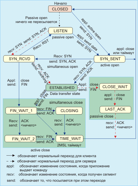 Состояние TIME_WAIT часто называется ожиданием длительностью 2MSL (Maximum Segment Lifetime). Значение MSL задается конкретной реализацией и определяет предельную величину пребывания сегмента в сети. В RFC-793 рекомендуется задавать MSL равным 2 мин. Но нужно помнить, что ТСР-сегмент транспортируется в IP-дейтаграмме, содержащем поле TTL. Когда модуль выполнил активное закрытие и в ответ на FIN послал ACK, соединение должно оставаться в состоянии TIME_WAIT в течение времени, в два раза превышающем MSL. Сокет, используемый данным соединение не может быть задействован другим соединением в продолжении указанного времени. Все сегменты данного соединения, задержавшиеся в пути, во время TIMR_WAITотбрасываются. Это гарантирует то, что сегменты старого соединения не будут восприняты новым соедиением. Такая процедура препятствует перезапуску серверов в течение 1-4 минут, так как в течение данного времени не могут использоваться стандартные значения номеров портов. Состояние FIN_WAIT_2 сопряжено со случаем, когда одна сторона послала сегмент FIN, а другая сторона подтвердила его получение. Если данное соединение не нужно, можно ждать, когда приложение другой стороны получит код конца файла и пришлет свой флаг FIN. Только после этого система перейдет из состояний FIN_WAIT_2 в состояние TIME_WAIT. Теоретически такое ожидание может быть бесконечным. Другая сторона при этом остается в состоянии CLOSE_WAIT, пока приложение не вызовет функцию close. Для решения проблемы часто вводят дополнительный таймер. В ТСР возможна ситуация, когда обе стороны запускают процедуру закрытия одновременно (посылают FIN), что в протоколе ТСР вполне допустимо. Каждая из сторон при этом переходит из состояния ESTABLISHED в состояние FIN_WAIT_1 (после вызова операции closed). По получении FIN стороны переходят из состояния FIN_WAIT_1 в состояние CLOSING и посылают ACK. После получения ACK происходит переход в состояние TIME_WAIT. Когда оператор, работая в диалоговом режиме, нажимает командную клавишу, сегмент, в который помещается эта управляющая последовательность, помечается флагом PSH (push). Это говорит приемнику, что информация из этого сегмента должна быть передана прикладному процессу как можно скорее, не дожидаясь прихода еще какой-либо информации. Сходную функцию выполняет флаг URG. URG позволяет выделить целый массив данных, так как активизирует указатель последнего байта важной информации. Будет ли какая-либо реакция на эту "важную" информацию определяет прикладная программа получателя. urg-режим используется для прерываний при работе с FTP, telnet или rlogin. Если до завершения обработки "важной" информации придет еще один сегмент с флагом URG, значение старого указателя конца "важного" сообщения будет утеряно. Это обстоятельство должно учитываться прикладными процессами. Так telnet в командных последовательностях всегда помещает префиксный байт с кодом 255. В режиме удаленного терминала (telnet/ssh) при нажатии любой клавиши формируется и поcылается 41-октетный сегмент (здесь не учитываются издержки Ethernet), который содержит всего один байт полезной информации. В локальной сети здесь проблем не возникает, но в буферах маршрутизаторов в среде Интернет могут возникнуть заторы. Эффективность работы может быть улучшена с помощью алгоритма Нагля (Nagle, 1984; RFC-896). Нагль предложил при однобайтовом обмене посылать первый байт, а последующие буферизовать до прихода подтв