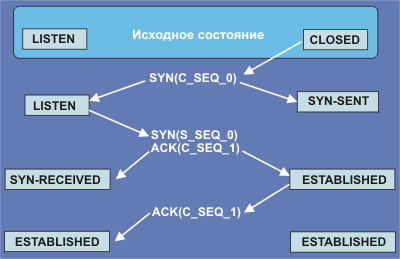 Стандартная процедура установления связи представлена на рисунке 4.4.3.3 (под словом “стандартная” подразумевается отсутствие каких-либо отклонений от штатного режима, например, одновременного открывание соединения со стороны сервера и клиента). Если же соединение одновременно инициируется клиентом и сервером, в конечном итоге будет создан только один виртуальный канал.