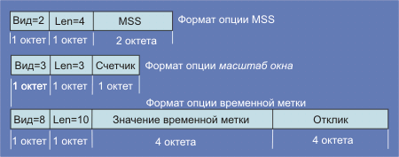 Рис. 4.4.3.2. Формат опций для TCP-сегментов Поле данные в TCP-сегменте может и отсутствовать, характер и формат передаваемой информации задается исключительно прикладной программой, теоретически максимальный размер этого поля составляет в отсутствии опций 65495 байт (на практике, помимо MSS, нужно помнить, например, о значении MTU для Ethernet, которое немногим больше 1500 байт). TCP является протоколом, который ориентируется на согласованную работу ЭВМ и программного обеспечения партнеров, участвующих в обмене информацией. Установление связи клиент-сервер осуществляется в три этапа: