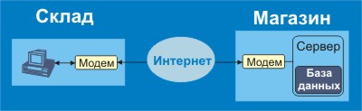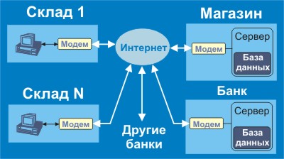Рис. 2.2. Продвинутая схема системы склад-магазин В реальной жизни сервер может размещаться на оптовом складе, который обслуживает сеть магазинов, база данных может быть распределенной и т.д., суть от этого не меняется. В любой из этих схем должна быть решена проблема безопасности и надежности передачи информации, а это роднит эти схемы со схемами электронной торговли. В общем случае взаимоотношения между складом и магазином могут быть исключительно коммерческими, что делает эти объекты субъектами, осуществляющими торговые операции. Взаимоотношения с современным банком в любом случае относится к сфере электронной коммерции. Наличие таких структур заметно стимулирует внедрение электронной торговли, так как эта технология предполагает взаимодействие различных систем распределенных баз данных. В общем случае в электронной коммерции могут быть задействованы 5 субъектов - продавец, покупатель, банкир, агент доставки и агент обслуживания. Взаимодействие этих субъектов и документооборот между ними регламентируется протоколом IOTP. Теперь попытаемся проанализировать, в чем заключаются преимущества и недостатки электронной торговли для покупателя и продавца.