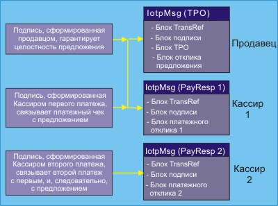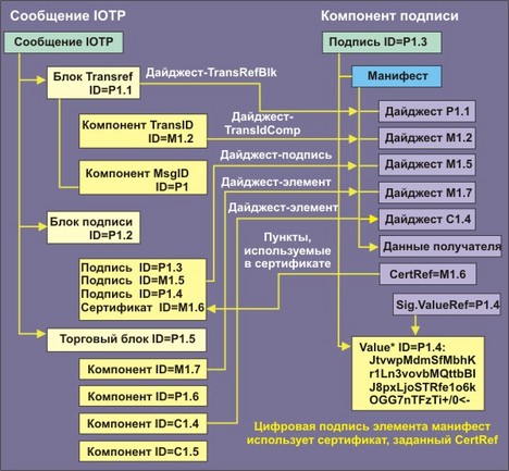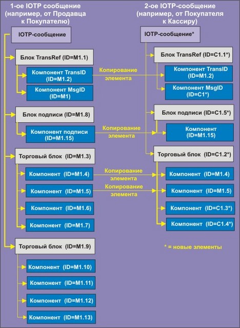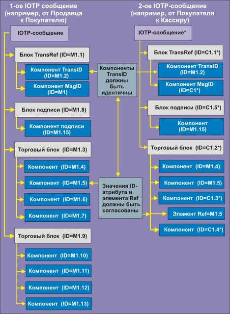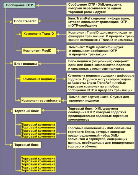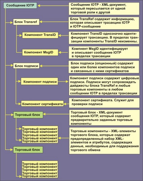 | Сообщение IOTP | Сообщение IOTP является самой внешней структурой, в которую помещаются документы, которыми обмениваются торговые роли, принимающие участие в сделке. Это хорошо сформатированный XML-документ. Документы, которые содержат сообщение, состоят из: o блок ссылок транзакции, служащий для однозначной идентификации, частью которой является сообщение IOTP; o опционный блок Signature, который служит для цифровой подписи торговых блоков или компонентов, связанных с транзакцией IOTP; o опционный блок Error для уведомления о технических ошибках, содержащихся в предыдущем полученном сообщении IOTP и o последовательность торговых блоков IOTP, которые несут данные, необходимые для выполнения транзакции. |