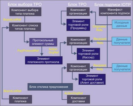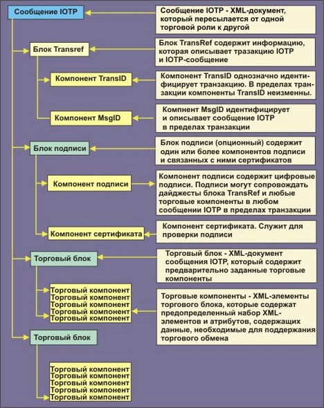 | Торговый блок | Торговый блок состоит из одного или более торговых компронент. Один или более торговых блоков может содержаться в IOTP-сообщениях, которые пересылаются в форме XML-документов от одной торговой роли к другой. Сущетсвует три типа торговых блоков: o блок Request, o блок Exchange или o блок Response |