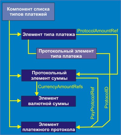 Компонент списка типов платежей содержит перечень допустимых видов платежа (например, MasterCard, Visa, Mondex, GeldKarte), платежные протоколы (например, SET Version 1.0, SCCD (Secure Channel Credit Debit - имя, используемое для платежей через кредитные карточки, где неавторизованный доступ блокируется с помощью механизма формирования безопасного транспортного канала, такого как SSL/TLS), а также сумма и вид валюты. Продавец посылает список типов платежей покупателю. Покупатель сравнивает типы платежей, протоколы, тип валюты и сумму со своими возможностями и делает выбор.