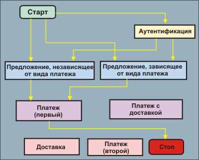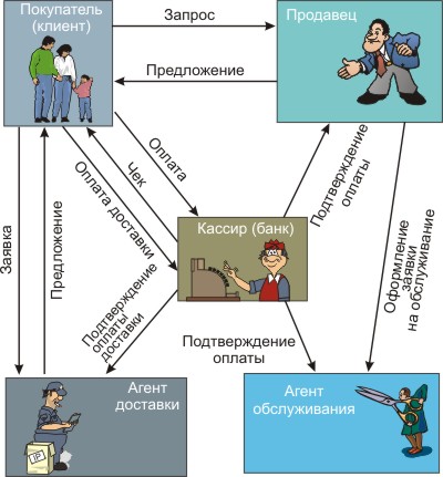 | 1. | Покупатель решает что-то купить и посылает информацию об этой операции (запрос предложения) Продавцу, напр., используя HTML. |