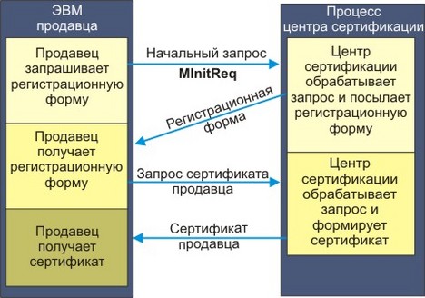 Продавец должен зарегистрироваться в СА до того, как он получит платежные инструкции от владельца карты или будет участвовать в транзакциях с расчетным центром. Перед посылкой запроса СА продавец должен получить его общедоступный ключ. Продавец должен также скопировать регистрационную форму в своем банке и идентифицировать получателя в запросе регистрации, посылаемом в СА. Регистрационная процедура начинается с посылки СА запроса сертификата СА, содержащего его общедоступный ключ и соответствующую регистрационную форму. СА идентифицирует банк продавца и выбирает подходящую регистрационную форму. В отклик СА вкладывается эта форма и его сертификат, содержащий общедоступный ключ. Этот сертификат продавец в дальнейшем использует в регистрационном процессе. Раз программа продавца имеет копию СА-сертификата, продавец может воспринимать платежные инструкции и обрабатывать транзакции SET. Прежде чем запрос сертификата будет обработан, продавец должен установить связь со своим банком (получателем). Продавцу нужны две пары общедоступных/секретных ключей - для ключевого обмена и для цифровой подписи. Эти ключи формируются программой продавца. Для регистрации продавец заполняет регистрационную форму, внося туда свое имя, адрес, идентификатор и т.д. Вместе с заполненной формой в СА посылается общедоступный ключ продавца. Эта информация подписывается программой продавца. Далее программа генерирует случайный симметричный ключ, который используется для шифрования запроса сертификата. Сам симметричный ключ шифруется с использованием общедоступного ключа СА и помещается в цифровой конверт. Сформированное таким методом сообщение посылается продавцом в СА.