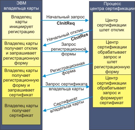 В вышеприведенном описании предполагалось, что все субъекты процедуры уже владеют соответствующими ключами. На практике до начала такого обмена все участники должны зарегистрироваться (пройти процедуру аутентификации через соответствующий центр), обменяться общедоступными ключами. Общедоступный ключ сопровождается электронной подписью отправителя (X.509v3). Схема регистрации владельца карты в центре сертификации (СА) показана на рис. 4.6.2.2. Процесс регистрации проходит через 7 состояний, начиная с отправки начального запроса и завершая получением сертификата. Эффективность сертификата при идентификации владельца карты сильно зависит от методов, используемых платежной системой карты и эмитентом карты для аутентификации владельца перед выдачей ему сертификата. Это достаточно критический процесс, учитывая то, что на этом этапе еще не используется цифровая подпись.
