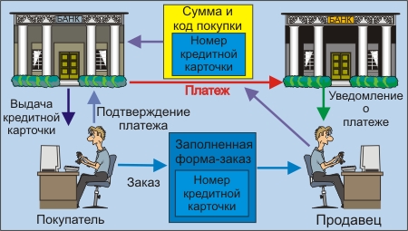 Для осуществления более мелких платежей используются другие схемы (например, First Virtual, CyberCoin, DigiCash (http://www.digicash.nl) или Millicent - http://www.millicent.digital.com/). Схема First Virtual (http://www.fv.com) предназначена для продажи дешевых программных продуктов или услуг. Она предполагает регистрацию клиента, при которой он сообщает номер своей кредитной карточки и получает регистрационный номер (PIN). При покупке клиент вводит свой индивидуальный номер и, если он верен, немедленно получает доступ к нужному ему продукту. Позднее First Virtual связывается с клиентом по электронной почте, уведомляет о цене покупки, предоставляя ему одобрить или нет снятие соответствующей суммы с его кредитной карточки. Эта система зиждется на полном доверии и честности обеих сторон.