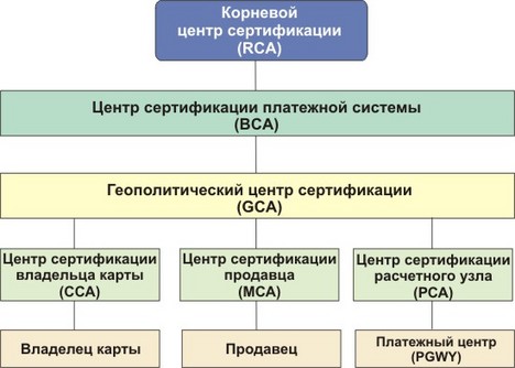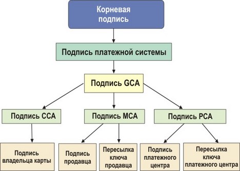 | Держатель карты (Cardholder) | Авторизованный владелец платежной карты, предоставленной ему эмитентом и предназначенной для выполнения платежей за покупки и услуги. | | Продавец (Merchant) | Субъект или фирма, предлагающие товары, информацию или услуги, получающие от этого прибыль в виде платежей. | | Эмитент (Issuer) | Финансовая организация, которая осуществляет выпуск платежных карт для клиентов и поддерживает функционирование их счетов. Эмитент гарантирует осуществление платежа для авторизованной транзакции. | | Получатель (Acquirer) | Финансовая организация, которая поддерживает продавцов, осуществляя операции с платежными картами. Получатель осуществляет сбор финансовых данных, имеющих отношение к транзакции, для получения авторизации платежа, который выполняет эмитент. | Расчетный центр (Payment Gateway) | Система, которая предоставляет коммерческие услуги продавцам через посредство получателя, и обеспечивает интерфейс получателю для авторизации и реализации транзакции. Расчетный центр обычно управляется получателем. | | Платежная система (Brand) | Система или компания, предоставляющая платежные средства (например, карты VISA, MasterCard и т.д.) | | Сертификационный центр (Certificate Authority -CA) | Агент одной или нескольких систем платежных карт, который осуществляет создание и рассылку сертификатов для продавцов, покупателей и расчетных центров. Участники транзакции могут иметь единый сертификационный центр, но могут работать и с разными центрами. Основная задача СА - гарантия того, что данное сообщение, ключ и т.д. посланы определенным субъектом, а не самозванцем. |
