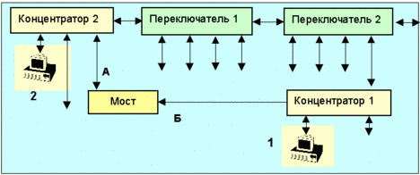 Рис. 5.4.1. Пример ошибочной топологии локальной сети Пакеты от машины 1 через концентратор 1 и 2 попадут в концентратор 2, эти же пакеты попадут туда через мост. В результате возникнет встречное кольцевое движение идентичных пакетов. Кроме того, переключатели и мост попытаются разобраться с этим безобразием и начнут посылать широковешательные пакеты, чтобы выяснить с каким из портов на самом деле связаны эти ЭВМ. Они от рождения убеждены, что одна и та же ЭВМ может быть доступна только через один порт. Таким образом, всплески загрузки сети, особенно широковещательной, должны привлекать внимание администратора. В данном примере, если система переключателей и мостов не поддерживает алгоритма “расширяющееся дерево”, администратор сам должен разорвать эту кольцевую структуру. Зацикливание пакетов возможно также при использовании внутреннего протокола маршрутизации IGRP, где некорректный выбор параметра вариация приводит к тому, что система при распределении потоков по нескольким направлениям воспринимает путь “назад”, как вполне приемлемый. Еще один вариант циклов пакетов возникает при использовании маршрутов по умолчанию (более детально это описано в разделе, посвященном маршрутизации 4.4.11). Так при наличии канала между сетями А и Б внешние маршрутизаторы этих сетей сконфигурированы так, что в сети А пакет адресованный не А, направляется в Б, а в сети Б все пакеты с местом назначения не Б, направляются сети А. Такая конфигурация возможна и она будет работать нормально до тех пор, пока в одной из сетей не появится пакет с ошибочным адресом, не соответствующем ни сети А, ни Б. Такой пакет будет двигаться между сетями А и Б до тех пор пока не выработает свой ресурс по TTL. Похожие проблемы возникают при реализации, например, протокола маршрутизации RIP (см. раздел 4.4.11.1), что сильно замедляет там процедуру установления равновесного маршрута. Протоколы маршрутизации работают с системами, где имеют место огромные задержки. И как всякая система управления с задержанной обратной связью такие системы склонны к осцилляциям. Допустим некоторый узел, оценив метрику нескольких маршрутов, принял решение перейти на новый маршрут. Если он это сделает, об этом окружающие маршрутизаторы узнают с заметной задержкой и соответствующим образом изменят свои оценки метрик фрагментов пути. Когда (снова с задержкой) исходный маршрутизатор получит информацию об этих оценкам, может случится, что старый маршрут окажется предпочтительнее нового, и все начнется сначала. Рассмотренные в данном разделе относительно экзотические явления (кроме примера из локальных сетей, здесь имеет место не экзотика, а стихийное бедствие) встречаются не так часто, но администратор сети должен принимать в расчет и такие возможности. Любой из упомянутых эффектов может сильно ухудшить эксплуатационные параметры сети, а то и вовсе вывести ее из строя. Назад: 5.3. Применение 6-го режима сетевого адаптера для целей диагностики |