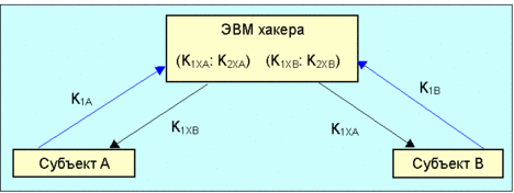 Рис. 6.4.1. Если хакер умудрится вставить свою ЭВМ в разрыв канала, соединяющего субъектов А и В, у него появляется возможность перехватывать в том числе и шифрованные сообщения. Пусть субъект А сформировал пару ключей К1А и К2А (ключ с индексом 2 является секретным), аналогичную пару ключей сгенерировал субъект В (К1В и К2В). Хакер же тем временем подготовил две пары ключей (К1ХА:К2ХА и К1ХВ:К2ХВ). Когда субъект А пошлет открытый ключ К1А субъекту В, хакер его подменит ключом К1ХА. Аналогичную процедуру он проделает с ключом К1В, посланным от В к А. Теперь сообщение А к В, зашифрованное с помощью ключа К1ХА будет послано В. Хакер его перехватывает, дешифрует с помощью ключа К2ХА, шифрует с помощью ключа К1ХВ и посылает В. Субъект В, получив послание, дешифрует его с помощью "секретного" ключа К2ХВ, полученного от хакера (о чем он, естественно, не подозревает). Аналогичная процедура будет проведена и при посылки сообщения от В к А. В сущности единственным параметром который изменится существенным образом будет время доставки сообщения, так как это время будет включать дешифровку и повторную шифровку сообщения. Но при использовании быстродействующей ЭВМ и при работе с традиционной электронной почтой это может оказаться незаметным. Понятно, что между А и В появится дополнительный шаг (hop). Но и это может быть легко замаскировано под прокси сервер или Firewall. Решить эту проблему можно путем пересылки открытого ключа своему партнеру по какому-то альтернативному каналу или сверки его по телефону. Полезную информацию по системам шифрования можно получить на следующих серверах: www.cs.hut.fi/crypto/ Назад: 6.3.1 Обзор некоторых видов сетевых атак |