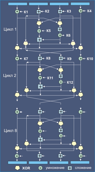Оглавление: Телекоммуникационные технологии Вперёд: 6.4.8. Алгоритм шифрования SAFER 6.4.7. IDEA - международный алгоритм шифрования данныхСемёнов Ю.А. (ГНЦ ИТЭФ), book.itep.ruIDEA является блочным алгоритмом шифрования данных, запатентованным швейцарской фирмой Ascom (http://fn2.freenet.edmonton.ab.ca/~jsavard/co0404.html). Фирма, правда, разрешила бесплатное некоммерческое использование своего алгоритма (применяется в общедоступном пакете конфиденциальной версии электронной почты PGP). Здесь в отличие от алгоритма DES не используются S-блоки или таблицы просмотра. В IDEA применяются 52 субключа, каждый длиной 16 бит. Исходный текст в IDEA делится на четыре группы по 16 бит. Для того чтобы комбинировать 16 битные коды, используется три операции: сложение, умножение и исключающее ИЛИ. Сложение представляет собой обычную операцию по модулю 65536 с переносом. При составлении таблицы умножения принимаются специальные меры для того, чтобы операция была обратимой. По этой причине вместо нуля используется код 65536. Рассмотрим алгоритм IDEA. Пусть четыре четверти исходного текста имеют имена A, B, C и D, а 52 субключа – К(1), К(2),…, К(52). Перед реализацией алгоритма выполняются операции: А = А*К(1); B = B + K(2); C = C + K(3); D = D * K(4); Первый цикл вычислений включает в себя: E = A XOR C; F = B XOR D Меняем местами В и С. Повторяем это всё 8 раз, используя К(7) – К(12) для второго раза и, соответственно, К(43) – К(48) - для восьмого. После восьмого раза В и С местами не меняются. Выполняем после этого операции: A = A * K(49) В результате закодированный текст имеет ту же длину, что и исходный. Схема этого весьма запутанного алгоритма может быть пояснена на рис. 6.4.7.1. По своему характеру алгоритм напоминает процедуры вычисления хэш-функции.