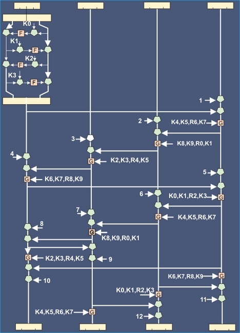 Рис. 6.4.7.2. Блок-схема алгоритма шифрования Skipjack G-перестановки включают в себя разделение группы из 16 бит на две подгруппы по 8 бит. Подобно DES левая половина кода не изменяется в процессе реализации цикла шифрования, а используется в качестве входного параметра F-функции, для результата которой и правой части кода выполняется операция XOR. В отличии от DES половины кода меняются местами лишь после завершающего цикла. F-функция G-перестановок достаточно проста: входные данные и субключ цикла объединяются операцией XOR, а результат заменяется кодом из таблицы просмотра (lookup-таблица - F). Субключи для G имеют длину 8 бит и являются первыми четырьмя байтами 80-битового исходного ключа. Первые 4 байта используются в первом цикле, следующие 4 – во втором, последние 2 байта вместе с первыми двумя – в третьем и т.д. 12 первых циклов реализации алгоритма шифрования Skipjack показаны на рис. 6.4.7.2. Первый цикл типа А отображен вместе со схемой реализации G-функции. Для следующих 7 циклов типа А G-функция отмечена квадратиком с буквой G. Цифрами (1-12) отмечен ввод данных для цикла с соответствующим номером. При реализации F-функции используется таблица (16*16) перестановок кодов 0-255. В случае дешифровки циклы выполняются в обратном порядке. Аналогом цикла А при дешифровке является последовательность операций: Для групп бит W1 и W2 и номера цикла выполняется операция XOR (циклы здесь нумеруются, начиная с 32 до 1). Затем W2 подвергается обратной G-перестановке, после чего выполняется перенос: W1 -> W4; W2 -> W1; W3 -> W2; W4 -> W3. Аналог цикла типа В при дешифровке включает в себя следующие операции: Группа бит W2 подвергается обратной G-перестановке. W3 объединяется с номером цикла и группой бит W2 с помощью операции исключающее ИЛИ. После чего производится перемещение: W1 -> W4; W2 -> W1; W3 -> W2; W4 -> W3. Назад: 6.4.6. Алгоритм Диффи-Хелмана |