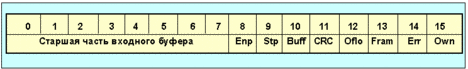 Оглавление: Телекоммуникационные технологии Вперёд: 8. Заключение 7.2. Сетевые драйверыСемёнов Ю.А. (ГНЦ ИТЭФ), book.itep.ruЧитатели, знакомые с телекоммуникационными протоколами, могут заинтересоваться тем, как писать прикладные программы для работы с пакетами. Прикладная программа взаимодействует с драйвером сетевого интерфейса. Ethernet-интерфейс, как и всякий другой, содержит несколько статусных управляющих регистров (CSR) и один или несколько регистров данных. Запись (чтение) в эти регистры выполняется в IBM/PC с помощью команд IN (OUT). Каждому регистру ставится в соответствие определенный номер порта. Блок номеров портов задается с помощью переключателей на интерфейсе или в процессе постановки пакетного драйвера. В последнем случае в AUTOEXEC-файле должна присутствовать строка, например (для DOS): NE2000 0x60 0x5 0x300, (если ваша ЭВМ снабжена интерфейсом типа NE2000). Здесь предполагается, что интерфейс будет использовать номер прерывания 0x60, аппаратное прерывание 0x5 и блок портов, начиная с шестнадцатеричного адреса 0x300 (io_addr). Следует иметь в виду, что разные интерфейсы могут иметь разное число CSR-регистров и отличные от приведенных ниже функции (NE2100). Интерфейс характеризуется тремя целыми числами: класс (8 бит), тип (16 бит) и номер. Класс говорит о том, для какой из сетевых сред предназначен данный прибор (PPP, DIX Ethernet, IEEE 802.3, IEEE 802.5, Pronet-10, Appletalk и т.д.). Тип описывает конкретную реализацию интерфейса (NE2000, NI5210, 3C501 и т.д.). Тип 0xffff соответствует всем интерфейсам данного класса. В случае, когда ЭВМ оснащена более чем одним интерфейсом идентичного типа, для их идентификации используется номер. На рис. 7.2.1 показана структура управляющего (CSR) регистра сетевого интерфейса. В таблице 7.2.1 приведен перечень основных классов с примерами определенных типов интерфейсов.