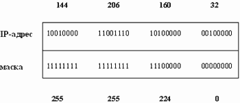 Маска подсети - это четыре байта, которые накладываются на IP-адрес для получения номера подсети. Например, маска 255.255.255.0 позволяет разбить сеть класса В на 254 подсети по 254 узла в каждой. На рисунке 2.18 приведено маскирование подсети 144.206.160.0 из предыдущего примера.