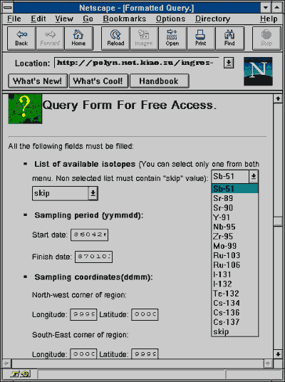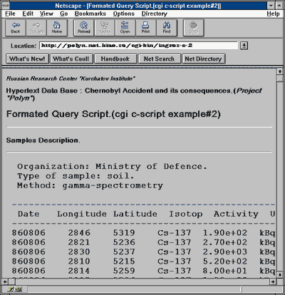 В приведенном выше примере программа получает данные через стандартный ввод. Это значит, что используется метод доступа POST. Число получаемых байтов указывается в переменной окружения CONTENT_LENGTH. Следует обратить внимание на то, что первой строкой записи в стандартный вывод является строка, определяющая тип информации. В данном случае он определен как текст HTML. Важно также отметить, что в этом операторе вывод завершается двумя переводами на новую строку, т.к. пустая строка должна разделять заголовок и тело сообщения, возвращаемого серверу. Остальные операторы выводят данные в виде HTML-предложений, формируя HTML-документ. При написании скриптов следует учитывать то, что сервер обычно стартует в момент, когда не все пути могут быть определены, поэтому при обращении к ресурсам следует указывать полные пути для этих ресурсов. Доступ к базе данных под управлением Ingres. Система управления базами данных Ingres является одной из популярных CУБД, работающих в среде операционной системы UNIX. Использование технологии разработки CGI-скриптов помогает построить современный дружественный интерфейс для пользователей WWW к базам данных под управлением данной СУБД. Начнем обсуждение этой возможности с простейших способов обращения с СУБД. #!/bin/sh echo Content-type: text/plain echo ingres polyn < query #The end of script В данном случае запрос заранее подготовлен в виде файла query. Скрипт не получает данных из интерфейсной программы, и действует по жесткой схеме запроса. Аналогично можно вызвать скрипт, выполняющий утилиты Ingres: #!/bin/sh echo Content-type: text/plain echo helpr polyn #The end of script В данном случае скрипт возвращает справку по базе данных polyn. Естественно, что можно использовать не только тип text/plain, но и text/html. Пример такого использования приведен ниже: #!/bin/sh echo Content-type: text/html echo echo '< PRE> ' helpr polyn situat echo '< /PRE> ' #The end of script Выполнение жестких запросов не очень интересно для пользователя. Он обычно жаждет сформулировать свой собственный запрос. В следующем примере скрипту передается запрос методом доступа GET, который помещен в переменную окружения QUERY_STRING: #!/bin/sh echo Content-type: text/html echo echo '< PRE> ' echo $QUERY_STRING | tr "+" " " | ingres polyn echo '< /PRE> ' #The end of script Прежде всего данные посылаются на предобработку, т.к. все пробелы в запросе заменяются на знак "+" в соответствии с правилами HTTP. После этого фильтра данные поступают на стандартный ввод интерпретатора Ingres и результат работы возвращается пользователю. Вообще говоря необходима фильтрация и на выходе после Ingres, т.к. вывод содержит неотображаемые символы, например символ '/007', который лучше заменить на что-нибудь отображаемое. Отчеты могут быть достаточно большими, поэтому имеет смысл ограничить отчет определенным числом строк: #!/bin/sh echo Content-type: text/html echo echo '< PRE> ' echo $QUERY_STRING | sed -f symbols | ingres polyn | tr "\007" "*" | head 100 echo '< /PRE> ' #The end of script В данном случае размер отчета ограничен 100 записями. Обратите внимание, в качестве фильтра используется sed, который выполняет правильное преобразование символов из формата HTTP в обычный ASCII. При формировании файла symbols (правила преобразования) следует помнить о порядке выполнения правил преобразования. Одним из недостатков приведенных выше скриптов является невозможность или достаточно большая сложность преобразования выходной информации Ingres. Если необходимо получить отчет со встроенными в его текст ссылками и картинками, то лучше использовать универсальный язы