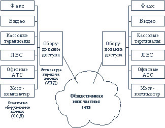 3. Главные тенденции развития глобальных сетей передачи данныхГлобальные сети, которые также называют территориальными, служат для того, чтобы предоставлять свои сервисы большому количеству конечных абонентов, разбросанных по большой территории - в пределах области, региона, страны, континента или всего земного шара. Ввиду большой протяженности каналов связи построение глобальной сети требует колоссальных затрат, в которые входит стоимость кабелей и работ по их прокладке, затраты на коммутационное оборудование и промежуточную усилительную аппаратуру, обеспечивающую необходимую полосу пропускания канала, а также эксплуатационные затраты на постоянное поддержание в работоспособном состоянии разбросанной по большой территории аппаратуры сети. Глобальные сети обычно создаются крупными телекоммуникационными компаниями для оказания платных услуг абонентам. Такие сети называются публичными или общественными сетями. Гораздо реже глобальная сеть полностью создается какой-нибудь крупной корпорацией (такой, например, как DigitalEquipment) для своих внутренних нужд. В этом случае сеть называется частной. Очень часто встречается и промежуточный вариант - корпоративная сеть пользуется услугами или оборудованием общественной глобальной сети, но дополняет эти услуги или оборудование своими собственными. Наиболее типичным примером здесь является аренда каналов связи, на основе которых создаются собственные территориальные сети. Высокая стоимость территориальных сетей приводит еще и к тому, что для оправдания затрат предприятие стремится в рамках одной сети совместить многообразные сервисы: передачу пакетов локальных сетей, передачу пакетов миникомпьютеров и мейнфреймов, обмен факсами, передачу трафика офисных АТС и выход в городские, междугородние и международные телефонные сети, обмен видеоизображениями для организации видеоконференций, передачу трафика кассовых аппаратов, банкоматов и т.д. и.т.п. Набор сервисов глобальной сети, который может потребоваться предприятию для связи двух своих отделений, приведен на рисунке 3.1.