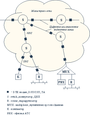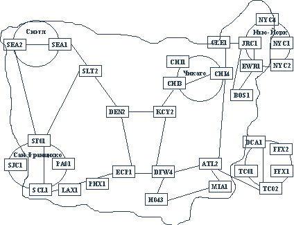 Пример магистрали АТМ такого провайдера как компания UUNET показан на рисунке3.8. Магистраль построена на каналах и коммутаторах скорости OC-12 (аналог STM-4) 622 Мб/с и помогает провайдеру справляться с удваивающимся каждые три месяца объемом передаваемого трафика. Практически все национальные телеоператоры развитых европейских стран также предоставляют услуги публичных сервисов АТМ. В этот ряд входят British Telecom, Deutsche Telekom, Finnet Group, France Telecom, Swiss Telecom, Telecom Italia, Telefonica de Espana и другие. В основном предоставляется сервис CBR для телефонного трафика и VBR для всех остальных. Часто сервис АТМ оказывается дешевле сервиса framerelay, если посчитать стоимость одного Мб/с в месяц. Так, постоянный виртуальный канал АТМ в Финляндии стоит $300 за Мб/с в месяц, а постоянный виртуальный канал framerelay - $1000.
