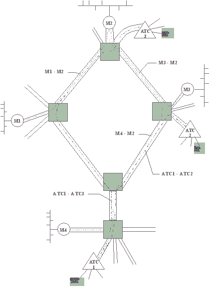 3.1.1.3. Примеры сетей SDH Примером российских сетей SDH могут служить сети "Макомнет", "Метроком" и "Раском" совместных предприятий с американской компании AndrewCorporation. Сеть "Макомнет" Начало создания сети "Макомнет" относится к 1991 году, когда был образовано совместное предприятие, учредителями которого выступили Московский метрополитен и компания Andrew (США). Транспортной средой сети стали одномодовые 32-, 16- и 8-ми жильные волоконно-оптические кабели фирмы Pirelli, проложенные в туннелях метрополитена. В метро было уложено более 350 км кабеля. Постоянно расширяясь, сегодня кабельная система "Макомнет" с учетом соединений "последней мили" составляет уже более 1000 километров. Изначально в сети "Макомнет" использовалось оборудование SDH только 1 уровня (155 Мбит/с) - мультиплексоры TN-1X фирмы NorthernTelecom (Nortel), обладающие функциями коммутации 63 каналов E1 по 2 Мб/c каждый. Из данных мультиплексоров было организовано две кольцевые топологии "Восточная" и "Западная" (они разделили кольцевую линию метрополитена на два полукольца вдоль Сокольнической линии) и несколько отрезков "точка-точка", протянувшихся к ряду клиентов, абонировавших сравнительно большие емкости сети. Эти кольца образовали магистраль сети, от которой ответвлялись связи с абонентами. Растущие день ото дня потребности заказчиков заставляли создавать новые топологии и переконфигурировать старые. В течение двух лет "Макомнет" решал задачу увеличения пропускной способности за счет прокладки новых кабелей и установкой нового оборудования, позволивших утроить количество топологий по кольцевой линии. Число узлов коммутации возросло до семидесяти. Но настал момент, когда остро встал вопрос о количестве резервных оптических волокон на некоторых участках сети, и с учетом прогнозов на развитие было принято решение о построении нового, 4-го уровня SDH (622 Мбит/с). Подготовительные работы по переконфигурации и введению действующих потоков в сеть нового уровня происходили без прекращения работоспособности сети в целом. В качестве оборудования 4 уровня (622 Мбит/с) "Макомнет" установила мультиплексоры TN-4X фирмы Nortel. Вместе с новым оборудованием была приобретена принципиально новая высокоинтеллектуальная система управления NRM (NetworkResourceManager). Эта система является надстройкой над системами управления оборудования 1 и 4 уровней. Она обладает не только всеми функциями контроля оборудования, присущими каждой из систем, но и рядом дополнительных возможностей: автоматической прокладки канала по сети, когда оператору требуется лишь указать начальную и конечную точки; функциями инвентаризации каналов, обеспечивающих их быстрый поиск в системе и рядом других. Ввод всего шести узлов TN-4X значительно увеличил транспортную емкость сети, а высвободившиеся волокна сделали возможным дальнейшее наращивание таковой. Сегодня количество адресов размещения оборудования превысило 500, а персонал службы эксплуатации составляет девятнадцать человек. Время устранения аварии по внутренним нормативным документам варьируется от 30 минут до 2 часов, в зависимости от удаленности места аварии от Центра управления. "Макомнет" предлагает заказчикам выделенные линии следующих уровней передачи данных: канал от 64 Кбит/с до Nx64 (где N=1..31); канал E1 - 2,048 Мбит/с. Сегодняшняя топология сети "Макомнет" выглядит следующим образом: