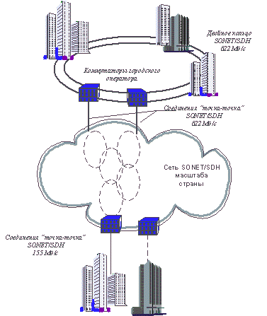 Рис. 3.3. Первичная сеть для образования цифровых выделенных каналов На базе сетей плезиохронной иерархии можно строить сети более высокого уровня, например, сети с коммутацией пакетов. Так, долгое время магистраль Internet в Америке работала на основе каналов T3 со скоростью 45 Мб/с. Эти же каналы можно использовать для построения цифровой телефонной сети. Иерархия скоростей - очень удобная вещь, так как позволяет выбирать скорость канала, близкую к требуемой. Для доступа мелких абонентов можно использовать каналы 64 Кб/c, доступ более крупных абонентов организовать по каналам E1, а магистраль сети строить на каналах E3. Однако, технология плезиохронной иерархии обладает рядом ограничений и недостатков. Поэтому сегодня наиболее перспективной для построения первичной сети является технология синхронной цифровой иерархии, стандартизованная ANSI под названием SONET (SynchronousOpticalNETwork). Очень близкий к SONET стандарт ITU-T имеет название SDH (SynchronousDigitalHierarchy, SDH). Далее, для простоты, будет упоминаться только технология SDH, но все это в равной степени относится и к технологии SONET. Технология SDH улучшает технологию плезиохронной цифровой иерархии во многих отношениях: