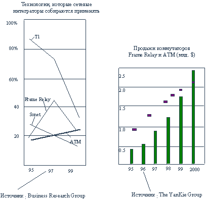 Результаты опроса более 200 специалистов по корпоративным сетям показывают, что затем ситуация может измениться в пользу АТМ, так как к 1999 году более 25% опрошенных собирается строить корпоративную магистраль на сервисах АТМ, в то время как процент собирающихся строить ее к этому сроку на других технологиях резко падает (рис.3.7).