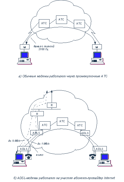 5.2.2. Цифровые абонентские линии технологий *DSL - новый метод высокоскоростного доступа по обычным медным парам Сегодня многие телекоммуникационные компании Америки и развитых стран Европы собираются начать активное внедрение различных вариантов цифровых абонентских линий (DSL). В последнее время наибольшее внимание специалистов привлекла технология асимметричной цифровой абонентской линии (AsymmetricDigitalSubscriberLine, ADSL), но помимо нее пользователям будут предложены также службы симметричной цифровой абонентской линии (SDSL), цифровой абонентской линии с переменной скоростью (RateAdaptiveDSL, RADSL) и сверхбыстрой цифровой абонентской линии (Veryhigh-speedDSL, VDSL). Еще один вариант этой технологии - быстрая цифровая абонентская линия (High-speedDSL, HDSL) - уже используется сегодня в информационных каналах типа Т-1 и Е-1, но ее создатели сейчас работают над тем, чтобы превратить ее в технологию сетевого доступа. Все эти технологии рассчитаны на высокоскоростную передачу данных на коротком отрезке витой пары, соединяющей абонента с ближайшей телефонной АТС, то есть на решение проблемы "последней мили", отделяющей потребителя от провайдера услуг. В то время как обычные модемы (V.34, V.34+) рассчитаны на работу с полосой пропускания в 3100 Гц, модемы *DSL могут получить в свое распоряжение полосу порядка 1 МГц - эта величина зависит от расстояния до АТС и сечения используемых проводов. Отличия условий работы *DSL-модемов от обычных модемов показаны на рисунке 5.6 на примере ADSL-модемов.