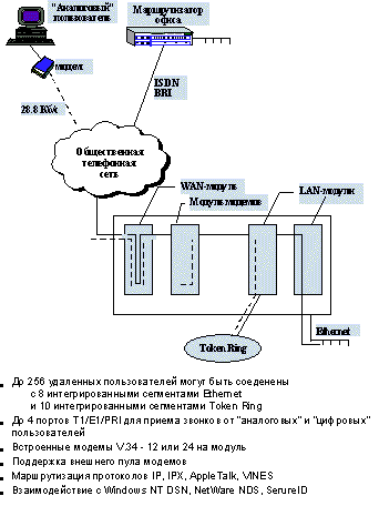 Ни один из предложенных проектов еще не принят в качестве стандарта. Несмотря на это, модемы, работающие по технологиям 56Кбит/с, уже предлагаются конечному потребителю (стоимость около $200), а компании Cisco и BayNetworks объявили о поддержке технологии К56flex в своих серверах удаленного доступа. Недавно стало известно, что сеть IBMGlobalNetwork начала предоставлять доступ в Internet и к корпоративным сетям по технологии х2 в 18 городах США. В ближайшее время число таких городов увеличится до 500. По крайнем мере один российский узел доступа к Internet, а именно RiNet, принадлежащий компаниям PlusCommunications и Cronix+, в начале мая начал предоставлять своим клиентам доступ по протоколу х2. По некоторым данным уже сейчас более трети московских номеров способны обеспечить скорость передачи от поставщика услуг более 33,6 Кбит/с. В то время, когда технологии х2 и K56flex только "начинают набирать обороты", появляются сообщения о намерениях некоторых производителей модемов начать выпуск устройств, способных передавать данные со скоростью до 100 Кбит/с по двум обычным телефонным линиям. Имена фирм-первопроходцев никого не удивят - это U.S. Robotics и Hayes. В отличие от технологии ISDN, когда по одной телефонной паре (при наличии у оператора специальной аппаратуры) достижима скорость 128 Кбит/с, для внедрения новой технологии от телефонной компании не потребуется никакого обновления аппаратуры. И уж совсем необычным кажется намерение фирмы RampNetworks запустить устройство WebRampM3, которое позволит по трем телефонным линиям достичь скорости передачи данных 168 Кбит/с. 5.2.4. Использование сетей кабельного телевидения и кабельных модемов для скоростного доступа к сети провайдера Идея использования имеющейся инфраструктуры связей конечных пользователей с поставщиками телекоммуникационных услуг для доступа в Internet овладела не только телефонными компаниями. Существует и другой сорт компаний, кабели которых протянулись практически в каждую квартиру - это компании, занимающиеся кабельным телевидением. Они тоже хотят предоставлять всем своим абонентам высокоскоростной доступ в Internet и для этих целей уже разработан специальный вид модемов - кабельные модемы. В кабельных модемах используется имеющийся коаксиальный 75-омный телевизионный кабель для передачи данных из сети в компьютер со скоростью до 30 Мб/с, а из компьютера в сеть - со скоростью до 10 Мб/с. При этом качество передаваемых сигналов очень высокое. Кабельные модемы пока не стандартизованы, а стоимость первых образцов составляет около $1000. Арендная плата такой линии оценивается в сумму $500 в месяц. 5.2.5. Интегрированные серверы удаленного доступа В последнее время практически все компании, выпускающие средства удаленного доступа, выпустили на рынок одну или даже несколько моделей так называемых интегрированных серверов удаленного доступа. Интегрированный сервер удаленного доступа предназначен для крупных организаций или провайдеров, которым нужно одновременно принимать звонки от нескольких десятков или сотен пользователей. Такой сервер подключается с помощью высокоскоростного цифрового интерфейса - канала T1/E1 или ISDNPRI - к городской телефонной цифровой станции. Высокоскоростных интерфейсов может быть и несколько. Через один интерфейс сервер может поддерживать от 23 до 30 одновременных соединений с удаленными пользователями, в зависимост