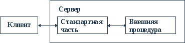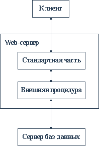 Рис. 9.6. Вызов внешней процедуры Web-сервера Заметим, что подход CGI является более надежным (внешняя программа выполняется в отдельном адресном пространстве), но менее эффективным, чем подход API (в этом случае внешние процедуры компонуются совместно со стандартной частью Web-сервера).