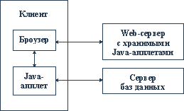 Рис. 9.7. Доступ к базе данных в Intranet-системе Аналогичная техника широко используется для обеспечения унифицированного доступа к базам данных в Intranet-системах. Язык HTML позволяет вставлять в гипертекстовые документы формы. Когда браузер натыкается на форму, он предлагает пользователю заполнить ее, а затем посылает серверу сообщение, содержащее введенные параметры. Как правило, к форме приписывается некоторая внешняя процедура сервера. При получении сообщения от клиента сервер вызывает эту внешнюю процедуру с передачей параметров пользователя. Понятно, что такая внешняя процедура может, в частности, играть роль шлюза между Web-сервером и сервером баз данных. В этом случае параметры должны специфицировать запрос пользователя к базе данных. В результате получается конфигурация информационной системы, схематически изображенная на рисунке 9.7. На принципах использования внешних процедур основывается также возможность модификации документов, поддерживаемых Web-сервером, а также создание временных "виртуальных" HTML-страниц. Даже начальное введение в Intranet было бы неполным, если не упомянуть про возможности языка Java. Java - это интерпретируемый объектно-ориентированный язык программирования, созданный на основе языка Си++ с удалением из него таких "опасных" средств как адресная арифметика. Мобильные коды (апплеты), полученные в результате компиляции Java-программы, могут быть привязаны к HTML-документу. В этом случае они поступают на сторону клиента вместе с документом и выполняются либо автоматически, либо по явному указанию. Апплет может быть, в частности, специализирован как шлюз к серверу баз данных (или к какому-либо другому серверу). При применении подобной техники доступа к базам данных схема организации Intranet-системы становится такой как на рисунок 9.8.