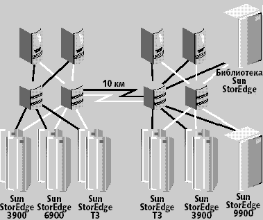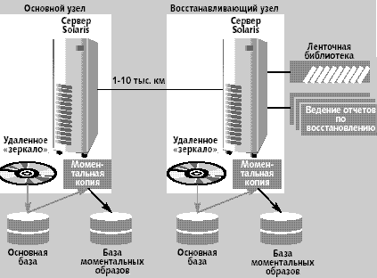 Ядром StorEdge Utilization Suite является управляющий унифицированный модуль (рис. 2) «Архиватор» (Archiver). В соответствии с той или иной политикой архивации и восстановления данных, предоставляемой из StorEdge Resource Management Suite, ядро организует выполнение последовательности регулярно исполняемых работ по сохранению и восстановлению данных. Archiver имеет набор методик быстрого параллельного поиска консолидированных данных, критичных по отношению к задачам хранения-восстановления. Доступ к реализациям этих методик базового модуля осуществляется с помощью агентов (arfind). Также Archiver имеет набор методик быстрого параллельного архивирования консолидированных данных, критичных по отношению к задачам хранения-восстановления. Доступ к реализациям этих методик базового модуля осуществляется с помощью агентов (arсору). StorEdge Utilization Suite в текущей версии требует для развертывания 30 Мбайт дискового пространства на сервере и совместим по базовой функциональности с системами архивации-восстановления из Oracle 9i, Veritas VxVM, Veritas NetBackup, Legato Networker, Tivoli SANergy Tivoli File Sharing API. StorEdge Availability Suite StorEdge Availability Suite — специализированное программное обеспечение для автоматизации управления консолидированным хранением данных в случаях, связанных с возможной потерей целостности инфраструктуры хранения. Система использует в качестве базовой политики механизм point-in-time копии данных и службу «удаленного зеркалирования» (remote mirror). Применение этих технологий для массивов SAN, построенных с применением RAID, позволяет снизить вероятность полной потери данных, что особенно важно для практического применения идеологии SAN в крупных информационных системах. Технология point-in-time позволяет регулярно получать полный моментальный «снимок» (snapshot) текущей структуры и актуального содержимого консолидированного банка данных сети хранения. Применение StorEdge Availability Suite позволяет выполнять копирование структуры и содержимого без прерывания обслуживания актуализированных процессов сетью хранения. StorEdge Availability Suite в режиме реального времени выполняет получение копий point-in-time и производит репликацию данных между физически разнесенными серверами консолидированных систем хранения (рис. 3). Объемы данных и расстояния между физическими серверами могут достигать значений в сотни терабайт и десятки тысяч километров, что позволяет вплотную приблизиться к абсолютному решению задач класса disaster recovery.