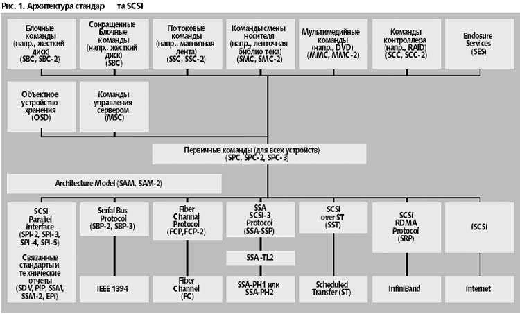 Каждая из подгрупп, входящих в состав SNIA IP Storage Forum, разрабатывает свой собственный стек протоколов под общим патронажем IETF. Членами форума являются свыше сорока компаний-участников SNIA. SAN и SCSIСделаем попытку проследить взаимосвязь между протоколами для альтернативных реализаций сетей хранения и общим для них стандартом SCSI. При различии технических решений их объединяет спецификация архитектуры SCSI, разрабатываемая техническим комитетом T10. В FCIP, iFCP и iSCSI, как и в Fibre Channel, в конечном счете, на уровне устройства реализуется стандарт команд SCSI. Иногда по неведению SCSI противопоставляют сетевым технологиям хранения, при этом совершенно ошибочно путая параллельный вариант SCSI — с него все действительно начиналось — с дальнейшими версиями этого интерфейса. В основном он поддерживается комитетом T10 (www.t10.org), который входит в состав Американского национального комитета по стандартизации ИТ (NCITS — National Committee on Information Technology Standards). T10 работает в тесном сотрудничестве с отраслевой ассоциацией SCSI Trade Association (www.scsita.org). За годы своего существования спецификация SCSI претерпела несколько редакций; на сегодняшний день актуальной является версия SCSI-3, построенная на принципах многоуровневой модели. Схема на рис. 1 представляет собой ее адаптацию к целям данного изложения, из нее исключены некоторые несущественные детали. В своем нынешнем состоянии схема спецификации состоит из корня — архитектурной модели SCSI (SAM — SCSI Architecture Model) и четырех ветвей. Модель можно разделить на два уровня. За два года, прошедших с момента публикации [1], где архитектура SCSI описана более подробно, модель SAM претерпела некоторые небольшие изменения, но принципиальные положения сохранились. Верхний уровень SAM, называемый CAM-3 (Common Access Method), в свою очередь делится на две части. Он состоит из общих для всех устройств наборов команд (SPC, SPC-2, SPC-3) и стоящих над ними наборов команд, специфичных для определенных типов устройств (например, с блочной записью, с потоковой записью, мультимедийных и т.д.). SAM не является чем-то жестко фиксированным, по мере появления новых типов устройств, она расширяется и пополняется. Нижний уровень архитектурной модели SCSI состоит из спецификаций, соответствующих конкретной физической реализации интерфейса. Отметим следующие: