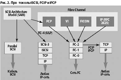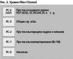 Из детализации, представленной на рис. 2, следует, что решения FCIP и iFCP уже по самому своему определению отличаются от iSCSI. Протокол iSCSI является вполне самостоятельной спецификацией, одной из семи существующих на сегодняшний день составляющих нижнего уровня архитектурной модели SCSI, в то время как FCIP и iFCP на самом деле суть альтернативные или дополняющие технологию Fibre Channel версии спецификации FCP, которая входит в число этих самых семи базисных спецификаций. Дело в том, что при выработке концепции SAN заранее изначально предполагалось, что сеть хранения не будет реализовываться исключительно средствами Fibre Channel; поэтому в ее основу была заложена многоуровневая модель, открывавшая возможность для альтернативных реализаций уровней, в частности, транспортного уровня. Появившиеся недавно протоколы FCIP и iFCP стали естественным развитием этой модели FCP. Вместе с ними на дереве появилась дополнительная ветвь. Они напрямую связаны с уровнем FC-4, т. е., если так можно сказать, «перехватывают» промежуточный уровень FC2 в модели FCP и «уводят» от Fibre Channel в IP. Этот механизм требует дополнительного пояснения. Напомним, что Fibre Channel — просто полнодуплексный последовательный коммуникационный интерфейс. В названии использовано французское слово для обозначения оптоволокна. Тем самым подчеркивается, что собственно присутствие оптики вовсе и не обязательно, возможна и классическая медная реализация, а возможны и те варианты, о которых в данном случае идет речь. Модель FC можно разделить на пять уровней, начиная с самого нижнего FC-0 и до верхнего FC-4. Три первых уровня (0, 1 и 2) иногда объединяют общим названием Fibre Channel Physical (PC-PH). Прокомментируем распределение основных характеристик Fibre Channel по уровням.