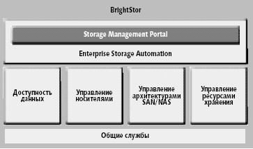 Средоточием централизованного управления хранением призван стать портал BrightStor Portal, позволяющий интегрировать на базе единого интерфейса всю информацию, приложения и другие элементы управления разнородными системами. BrightStor Portal на базе Windows 2000 обеспечивает доступ ко всем инструментам и информации, необходимой администратору инфраструктуры хранения для того, чтобы устанавливать и реализовывать согласованную политику доступа, планировать емкость хранения, задавать пороговые значения, контролировать производительность, получать отчеты, осуществлять централизованное управление резервированием на разных платформах и т.д. К категории систем для поддержки доступности данных СА отнесла продукты по резервированию/восстановлению данных, среди которых система ArcServe [5] для рабочих групп и департаментов и анонсированное прошлым летом решение BrightStor Entreprise Backup, ориентированное на резервное копирование в крупномасштабных центрах данных. Эта система формирует домены, каждый из которых контролируется своим сервером резервирования, но все они объединяются под управлением с общей консоли. Интересно, что в домен могут входить системы с разными операционными системами, которые будут резервироваться по единым для данного домена правилам с едиными параметрами защиты. В BrightStor Entreprise Backup реализован ряд механизмов, нацеленных на максимальное сокращение «окна резервирования», в том числе многопотоковое резервирование, резервирование на диск для быстрого восстановления, копирование «мгновенных снимков» на дисковых массивах. BrightStor Entreprise Backup поддерживает специальный «календарь» планирования операций резервирования, позволяет определять политики ротации магнитных лент и предоставляет различные средства генерации отчетов по процессам резервирования, состоянию устройств и носителей. BrightStor Entreprise Backup использует возможности сети хранения по разделению устройств хранения, динамическому назначению ленточных библиотек разнородным серверам и резервированию в обход серверов и локальной сети. Система также реализует несколько механизмов резервирования для NAS-конфигураций: с файлового сервера NAS непосредственно на ленту, через сервер резервирования и посредством другого файлового сервера. Как и другие, BrightStor Entreprise Backup обеспечивает разнообразные возможности для сохранения данных из основных почтовых систем, баз данных и приложений корпоративного управления. В эту же систему входят возможности по управлению носителями, включая управление хранилищами на лентах, создание пулов носителей и экспорт архивов на лентах за пределы рабочих помещений. Семейство BrightStor включает также программные средства виртуализации хранения на лентах Vtape для оптимизации использования ленточных библиотек. BrightStor SAN Manager базируется на возможностях флагманского продукта СА — Unicenter. Интеграция со средствами Unicenter по управлению производительностью, уровнем обслуживания, событиями, гарантирует качество работы соответствующих функций BrightStor SAN Manager. Так, например, BrightStor SAN Manager Event Console автоматизирует обработку событий без написания сложных скриптов, опираясь на соответствующие инструменты Unicenter. Используется технология Unicenter по представлению ИТ-ресурсов через призму бизнес-процессов — Business Process View (BPV). Благодаря этому элементы сети хранения могут группиров