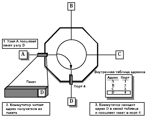 Используя таблицу адресов и содержащийся в пакете адрес получателя, коммутатор организует виртуальное соединение порта отправителя с портом получателя и передает пакет через это соединение. На рисунке 4 узел А посылает пакет узлу D. Найдя адрес получателя в своей внутренней таблице, коммутатор передает пакет в порт 4.