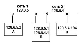Протокол ARP с представителемПротокол ARP с представителем является альтернативным методом, позволяющим шлюзам принимать все необходимые решения о маршрутизации. Он применяется в сетях с широковещательной передачей, где для отображения IP-адресов в сетевые адреса используется протокол ARP или ему подобный. Здесь мы вновь будем предполагать, что имеем дело с сетью Ethernet.Во многом метод, реализуемый протоколом ARP с представителем, аналогичен использованию маршрутов по умолчанию и сообщений перенаправления. Но протокол ARP с представителем не затрагивает таблиц маршрутов, все делается на уровне адресов Ethernet. Протокол ARP с представителем может использоваться либо для маршрутизации IP-пакетов ко всем сетям, либо только в локальной сети, либо в какой-то комбинации подсетей. Проще всего продемонстрировать его использование при работе со всеми адресами. Чтобы использовать протокол, нужно настроить узел так, как будто все машины в мире подключены непосредственно к вашей локальной сети Ethernet. В ОС UNIX это делается командой "route add default 128.6.4.2 0", где 128.6.4.2 - IP-адрес вашего узла. Как уже отмечалось, метрика 0 говорит о том, что все IP-пакеты, которым подходит данный маршрут, должны посылаться напрямую по локальной сети. Когда нужно послать IP-пакет узлу в локальной сети Ethernet, ваша машина должна определить Ethernet-адрес этого узла. Для этого она использует ARP-таблицу. Если в ARP-таблице уже есть запись, соответствующая IP-адресу места назначения, то из нее просто берется Ethernet-адрес, и кадр, содержащий IP-пакет, отправляется. Если такой записи нет, то посылается широковещательный ARP-запрос. Узел с искомым IP-адресом назначения принимает его и в ARP-ответе сообщает свой Ethernet-адрес. Эти действия соответствуют обычному протоколу ARP, описанному выше. Протокол ARP с представителем основан на том, что шлюзы работают как представители удаленных узлов. Предположим, в подсети 128.6.5 имеется узел 128.6.5.2 (узел A на рис.12). Он желает послать IP-пакет узлу 128.6.4.194, который подключен к другой сети Ethernet (узел B в подсети 128.6.4). Существует шлюз с IP-адресом 128.6.5.1, соединяющий две подсети (шлюз R).