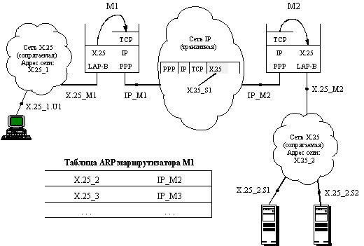 Инкапсуляция на сетевом уровне: X.25 поверх TCP, IPX поверх IPМетод инкапсуляции часто применяется, когда двум сетям, использующим один и тот же сетевой протокол, нужно связаться через транзитную сеть, которая работает с другими сетевыми протоколами. Примером могут служить две сети Х.25, которым нужно связаться между собой через сеть TCP/IP. В таких случаях сетевой протокол транзитной сети считается протоколом более низкого уровня, чем сетевой протокол объединяемых сетей (рисунок 3.2). Поэтому пакеты сетевого протокола сопрягаемых сетей Х.25 инкапсулируются в пакеты TCP транспортного уровня транзитной сети TCP/IP пограничным маршрутизатором М1, и переносятся в пакетах TCP по транзитной сети до следующего пограничного маршрутизатора М2. Для переноса по сети TCP/IP пакеты TCP в соответствии с технологией этой сети помещаются в пакеты IP, которые инкапсулируются в кадры протокола канального уровня, например, РРР. Пограничный маршрутизатор М2 извлекает пакет Х.25 из пакета TCP и отправляет его по сети Х.25 в соответствии с правилами этого протокола - то есть предварительно установив виртуальное соединение с узлом назначения по адресу Х.25_S1, а затем отправив по этому виртуальному соединению прибывший пакет.