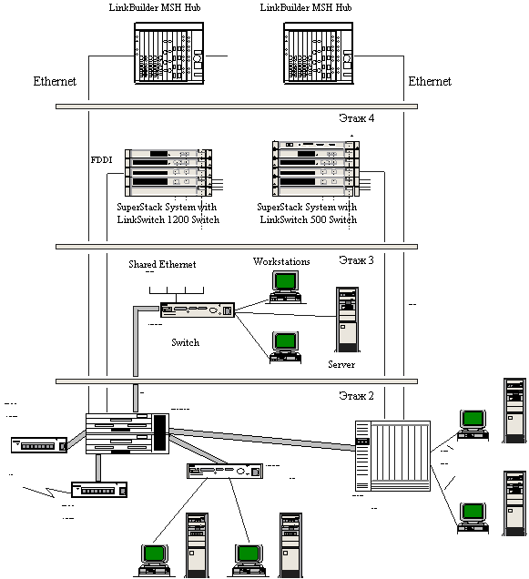 Поддерживаются основные маршрутизируемые протоколы сетевого уровня, включая TCP/IP, Novell IPX, XNS, OSI, DECnet, VINES, AppleTalk, DLSw, APPN. Могут использоваться такие протоколы обмена маршрутной информацией, как RIP-IP, RIP-IPX, OSPF, IS-IS и Novell NLSP. Для передачи пакетов по глобальным связям может осуществляться компрессия с коэффициентом сжатия до 1:4. Для работы по коммутируемым телефонным линиям поддерживаются различные стратегии вызова абонента - коммутация по протоколу PPP, вызов по требованию, возможность использования небольшого количества модемов или терминальных адаптеров ISDN для обслуживания большого количества удаленных точек, возможность использования резервной линии для увеличения пропускной способности в случае увеличения трафика или отказа основной линии, вызов абонента по расписанию. Для управления и администрирования моста/маршрутизатора NETBuilder II может использоваться система управления Transcend в средах Windows и UNIX. Так как мост/маршрутизатор NETBuilder II представляет собой в высокой степени программируемое устройство, то набор функций, которые он может выполнять по отношению к своим портам и линиям связи, во многом зависит от состава загруженного в его память программного обеспечения. Версия программного обеспечения NETBuilder II 8.1 состоит из отдельных модулей: моста, центрального маршрутизатора в архитектуре Boundary Routing, IP (вместе с RIP, OSPF, EGP, BGP), IPX (вместе с NLSP), XNS, PPP, компрессии данных, сервисов вызова по телефонным коммутируемым линиям, поддержки мультипроцессорной архитектуры. На рисунке 3.3 показан пример построения сети с использованием маршрутизатора NETBuilder II и основных моделей коммутаторов компании 3Com. Для расширения возможностей NETBuilder II по построению глобальных связей через цифровые телефонные сети ISDN компания 3Com выпустила два устройства расширения: NETBuilder II WAN Extender T1 и E1. Это отдельные устройства в архитектуре SuperStack, которые работают в качестве дополнительного ISDN-интерфейса для моста/маршрутизатора NETBuilder II. Эти устройства обеспечивают большое количество 64-килобитных каналов как для коммутируемых, так и для выделенных цифровых линий. Каждый такой канал данных представляет собой независимый коммуникационный путь к мосту/маршрутизатору в удаленной точке, и он представляется для NETBuilder II как отдельный "виртуальный" порт.