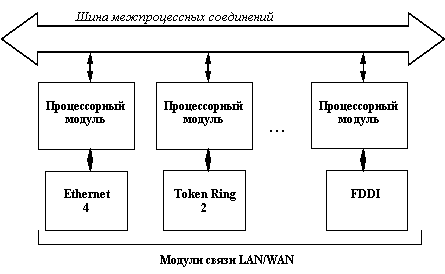 Центральный процессор принимает решения по фильтрации/продвижению пакетов, модифицирует заголовки пакетов, если это необходимо, передает пакеты непосредственно присоединенному модулю связи или другому процессорному модулю, обновляет базу данных адресной и топологической информации, поддерживает SNMP-управление и выполняет другую административную работу. Локальная память хранит маршрутные и адресные таблицы, а также другие данные, которые используются или были выработаны процессором данного модуля. Глобальная память представляет собой буфер, который хранит пакеты, передаваемые от модуля связи данного процессорного модуля или от другого процессорного модуля. Память называется глобальной, так как она видна из любого процессорного модуля и доступна ему. Пакеты передаются в глобальную память с помощью процессора прямого доступа к памяти (DMA processor). Процессорные модули поддерживают все основные сетевые протоколы: TCP/IP, OSI, DECnet Phase IV, Novell IPX, Banyan VINES, AppleTalk Phase 2, IBM SNA, X.25, Frame Relay, SMDS, ATM. Высокоскоростная шина межпроцессорных соединений PPX (Parallel Packet Express) обеспечивает скорость передачи данных 1 Гб/с. Используется 4 независимых, избыточных шины 256 Мб/с, нагрузка между которыми может балансироваться динамически. Шина обеспечивает высокую производительность и одновременно высокую отказоустойчивость. Каждый процессорный модуль подсоединен ко всем четырем шинам и может выбирать любую для передачи данных (рисунок 3.6). Определенная шина выбирается случайным образом для каждого пакета отдельно. Если одна из шин отказывает, то нагрузка перераспределяется между остальными. Программное обеспечение маршрутизаторов Wellfleet имеет распределенную архитектуру (рисунок 3.7).