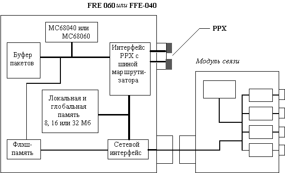 Процессорный модуль FRE (Fast Routing Engine) состоит из центрального процессора Motorola MC68040 33MHz, локальной памяти, глобальной памяти (общим объемом 8 Мб), процессора прямого доступа к памяти (DMA) и интерфейса с модулем связи (рисунок 3.5).