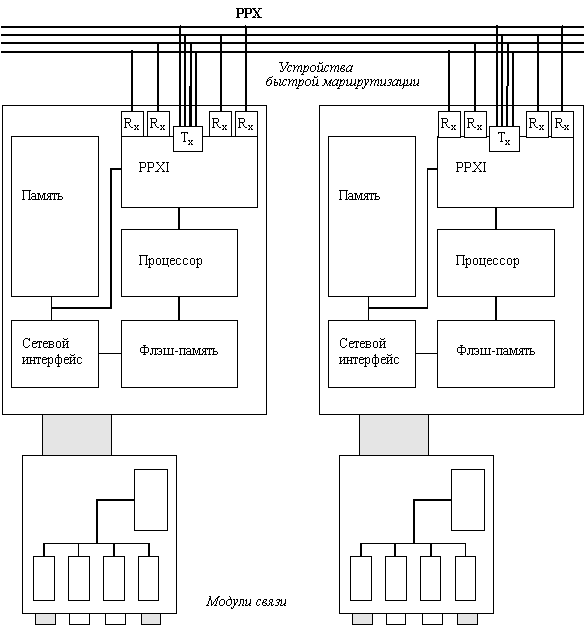 ![]() Рис. 3.6. Связь процессорных модулей по шине PPX Функции продвижения пакетов, их фильтрации и управления маршрутизатором распределены по симметричной схеме между процессорными модулями маршрутизатора. Это обеспечивает высокую производительность и отказоустойчивость, так как при отказе одного из процессорных модулей остальные продолжают выполнять свои функции. Вся обработка пакетов для интерфейсного модуля выполняется присоединенным к нему процессорным модулем. Каждый процессорный модуль имеет свою копию программного обеспечения, выполняющего функции моста и маршрутизатора, а также свои таблицы маршрутизации. При получении пакетов с обновленной маршрутной информацией все вычисления новых значений таблиц маршрутизации выполняются на одном процессорном модуле, а затем эти пакеты передаются остальным процессорным модулям для обработки.