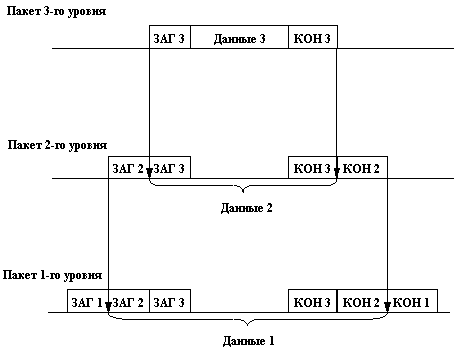 ![]() Рис. 5.1. Модель взаимодействия открытых систем ISO/OSI Итак, пусть приложение обращается с запросом к прикладному уровню, например к файловому сервису. На основании этого запроса программное обеспечение прикладного уровня формирует сообщение стандартного формата, в которое помещает служебную информацию (заголовок) и, возможно, передаваемые данные. Затем это сообщение направляется представительному уровню. Представительный уровень добавляет к сообщению свой заголовок и передает результат вниз сеансовому уровню, который в свою очередь добавляет свой заголовок и т.д. Некоторые реализации протоколов предусматривают наличие в сообщении не только заголовка, но и концевика. Наконец, сообщение достигает самого низкого, физического уровня, который действительно передает его по линиям связи. К этому моменту сообщение выглядит так, как показано на рисунке 5.2. (Здесь мы сознательно упростили картину, не рассматривая пока процедуры сборки-разборки пакетов.)