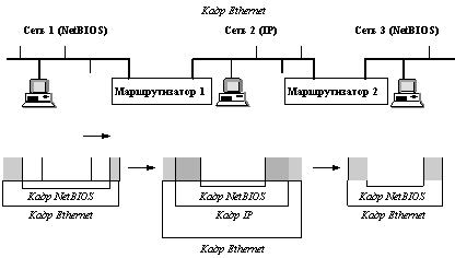 ![]() Рис. 1.3. Инкапсуляция протоколов сетевого уровня (вложение друг в друга) Метод инкапсуляции заключается в том, что пограничные маршрутизаторы, которые подключают объединяемые сети к транзитной, упаковывают пакеты транспортного протокола объединяемых сетей в пакеты транспортного протокола транзитной сети. В данном случае пакеты NetBIOS упаковываются в пакеты TCP, как если бы пакеты NetBIOS представляли собой сообщения протокола прикладного уровня. Затем пакеты NetBIOS переносятся по сети TCP/IP до другого пограничного маршрутизатора. Второй пограничный маршрутизатор выполняет обратную операцию - он извлекает пакеты NetBIOS из пакетов TCP и отправляет их по сети назначения адресату. Для реализации метода инкапсуляции пограничные маршрутизаторы должны быть соответствующим образом сконфигурированы. Они должны знать, во-первых, IP-адреса друг друга, во-вторых - NetBIOS-имена узлов объединяемых сетей. Имея такую информацию, они могут принять решение о том, какие NetBIOS-пакеты нужно переправить через транзитную сеть, какой IP-адрес указать в пакете, передаваемом через транзитную сеть и каким образом доставить NetBIOS-пакет узлу назначения в конечной сети. Инкапсуляция может быть использована для транспортных протоколов любого уровня. Например, протокол сетевого уровня Х.25 может быть инкапсулирован в протокол транспортного уровня TCP, или же протокол сетевого уровня IP может быть инкапсулирован в протокол сетевого уровня Х.25. Для согласования сетей на сетевом уровне могут быть использованы многопротокольные и инкапсулирующие маршрутизаторы, а также программные и аппаратные шлюзы. Обычно инкапсуляция приводит к более простым и быстрым решениям по сравнению с трансляцией, так как решает более частную задачу, не обеспечивая взаимодействия с узлами транзитной сети.