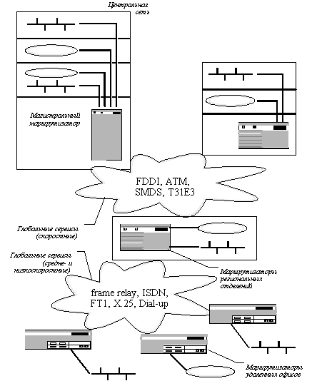 ![]() Рис. 2.3. Упрощенная схема использования маршрутизаторов различных типов