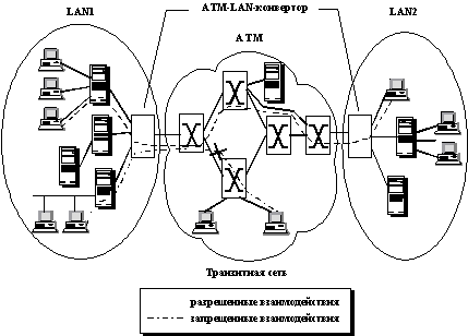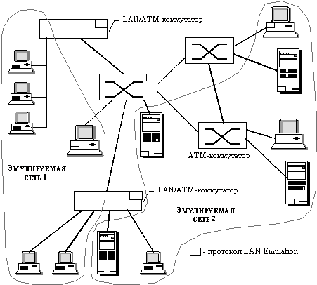 Технология LAN Emulation для согласования сетей ATM и традиционных сетевых технологийНазначение и общие принципы работыПоявление новой технологии АТМ потребовало решения задачи согласования этой технологии с уже существующими традиционными технологиями локальных сетей, такими как Ethernet или Token Ring. Для решения этой задачи в принципе могут быть использованы все обсуждавшиеся выше подходы к организации работы неоднородных сетей - мультиплексирование, трансляция и инкапсуляция протоколов. Однако мультиплексирование редко применяется для протоколов физического и канального уровней (к которым относится протокол АТМ), так как при этом требуется наличие нескольких сетевых адаптеров в каждом компьютере. Гораздо чаще для согласования протоколов канального уровня используется трансляция с помощью таких промежуточных устройств, как мосты, коммутаторы и маршрутизаторы. Однако мосты и коммутаторы способны выполнять трансляцию только близких технологий, например, Ethernet и FDDI или Ethernet и Token Ring, а задача трансляции существенно отличающихся технологий локальных и глобальных сетей для устройств этого типа является слишком сложной. Примером таких "плохо совместимых" пар протоколов могут служить Х.25 и Ethernet или frame relay и Ethernet. Поскольку технология ATM близка к технологиям территориальных сетей и плохо совместима с традиционными канальными протоколами локальных сетей, то в этом случае трансляционные возможности мостов и коммутаторов так же оказываются недостаточными. Маршрутизаторы же умеют выполнять трансляцию существенно отличающихся протоколов, используя для этого общий протокол сетевого уровня для всех согласуемых сетей. Для обеспечения совместимости ATM с протоколами канального уровня локальных сетей разработана спецификация Classical IP (RFC 1577), в которой в качестве объединяющего протокола сетевого уровня определен протокол IP. Такое решение хорошо работает, когда локальные сети объединяются с территориальной сетью АТМ, применение же этого подхода в случае, когда технология АТМ используется для построения локальной сети, не всегда оказывается эффективным. Во-первых, необходимость использования маршрутизаторов для локальных сетей не всегда является экономически оправданной. Во-вторых, не все локальные сети поддерживают протокол сетевого уровня - так, например, функции маршрутизации отсутствуют в часто используемом стеке SMB/NetBIOS. Поэтому возникла необходимость в создании технологии объединения сетей АТМ и традиционных локальных сетей без привлечения маршрутизаторов и протоколов сетевого уровня. Такой технологией и является технология LAN Emulation (LANE), разработанная организацией ATM Forum. Эта спецификация использует инкапсуляцию кадров канальных протоколов локальных сетей, таких как Ethernet или Token Ring, в ячейки АТМ. Использование инкапсуляции в спецификации LAN Emulation несколько отличается от ее традиционного применения. Обычно инкапсуляция обеспечивает связь двух сетей одной технологии через промежуточную сеть другой технологии. При этом узлы промежуточной сети недоступны конечным узлам объединяемых сетей (рисунок 2.4), и промежуточная сеть играет роль транзитной сети. LAN Emulation с помощью инкапсуляции решает не только традиционную задачу связи локальных сетей через транзитную сеть АТМ, но и решает общую задачу связи всех узлов составной с