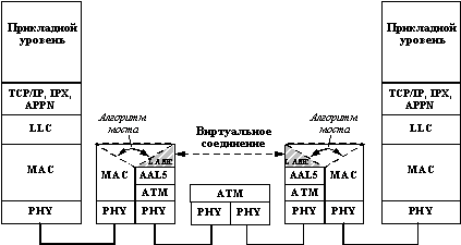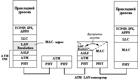 ![]() Рис. 2.4. Взаимодействие двух локальных сетей через транзитную сеть ATM Рассмотрим последовательно решение этих двух задач, причем для определенности будем предполагать, что сеть АТМ используется для соединения сетей Ethernet. Объединение локальных сетей через транзитную АТМ-сетьИтак, пусть сеть ATM используется только в качестве транзитной сети. Сети Ethernet подключаются к сети коммутаторов АТМ с помощью пограничных устройств, названных в спецификации LAN Emulation АТМ-LAN конверторами. Такой конвертор должен иметь ATM-порт, с помощью которого он подключается к АТМ-сети, а также некоторое количество портов для подключения локальных сетей традиционных технологий. Конвертор имеет АТМ-адрес для взаимодействия с другими конверторами по сети АТМ. Кроме того, конвертор должен иметь информацию о МАС-адресах всех узлов каждой из локальных сетей, которые он присоединяет к сети АТМ. Конвертором может быть любое устройство локальной сети, но наиболее подходящим устройством для выполнения этих функций является коммутатор локальной сети, так как он имеет таблицу МАС-адресов всех устройств сети, которые обмениваются через него данными. Поэтому будем далее использовать термины АТМ-LAN конвертор и ATM-LAN коммутатор как синонимы. В каждый АТМ-LAN коммутатор встроен протокол LAN Emulation (рисунок 2.5), в задачу которого входит передача принятого коммутатором МАС-кадра через АТМ-сеть другому ATM-LAN коммутатору. Так как к АТМ-сети может быть подключено несколько локальных сетей, то при получении из локальной сети кадра с МАС-адресом назначения, ATM-LAN коммутатор должен решить, к какому из остальных ATM-LAN коммутаторов относится данный МАС-адрес.